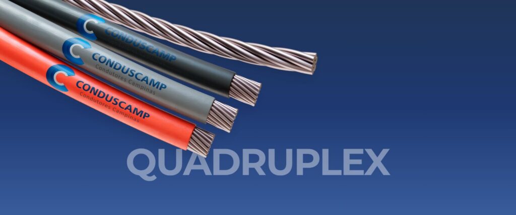 O cabo multiplexado quadruplex contém três condutores fase e um neutro mensageiro. Ele é amplamente utilizado em redes de distribuição de baixa tensão, especialmente em centros urbanos e áreas industriais com maior demanda elétrica. Sua configuração permite a distribuição de energia trifásica de forma segura e eficiente para comércios, indústrias de médio porte e condomínios.
